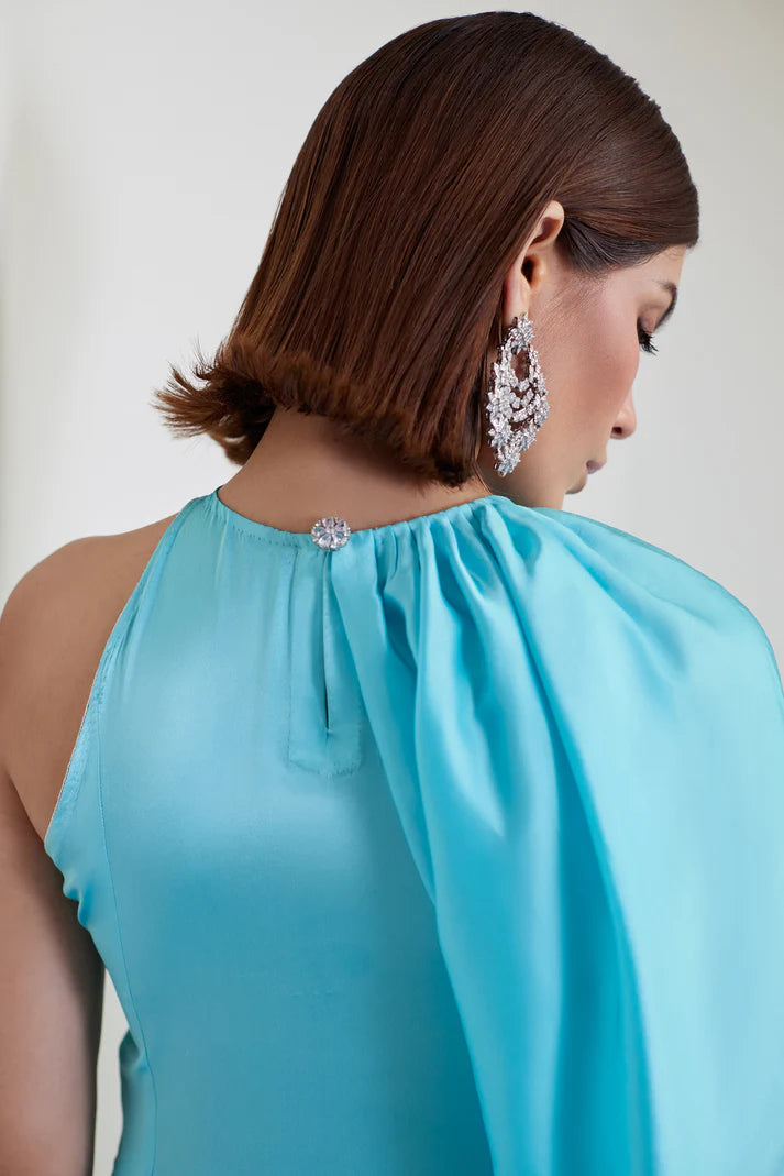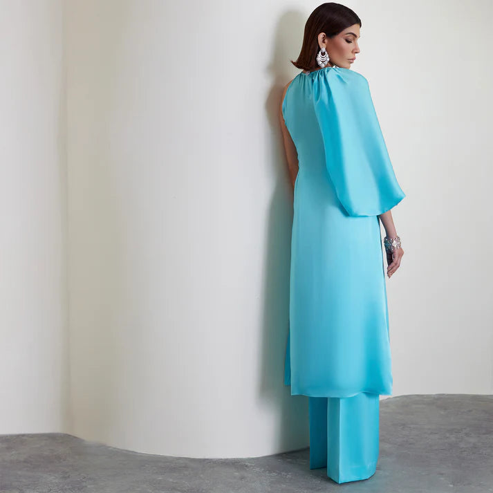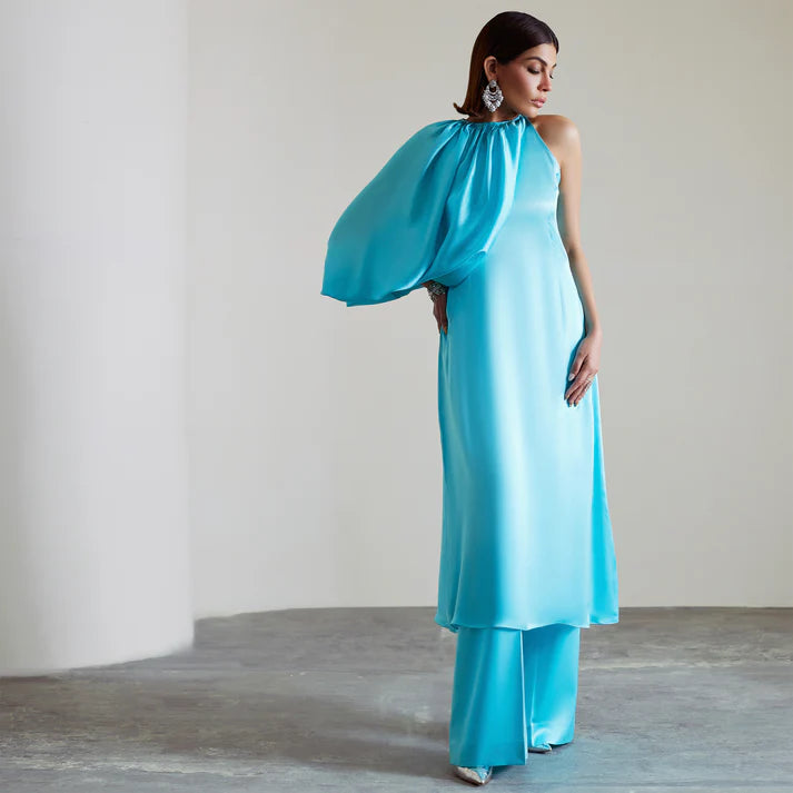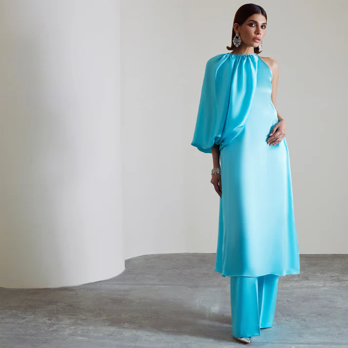 Featuring a chic halter neckline, this outfit plays with asymmetry through one dramatic puff sleeve and one sleeveless side perfect for those who love to stand out. Paired with sleek straight trousers, it’s a bold, fashion-forward.