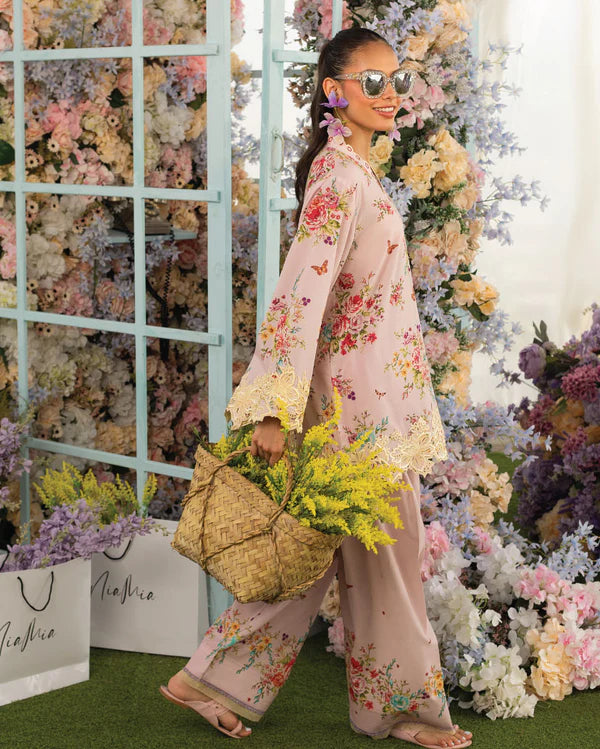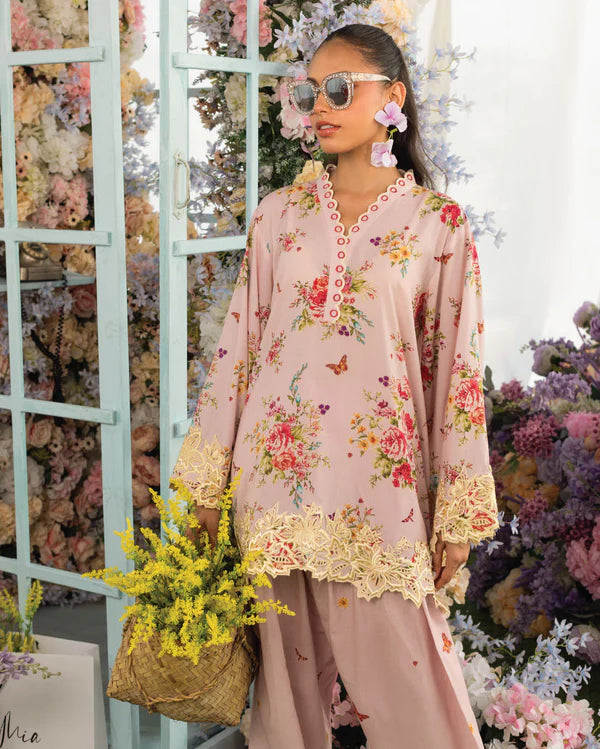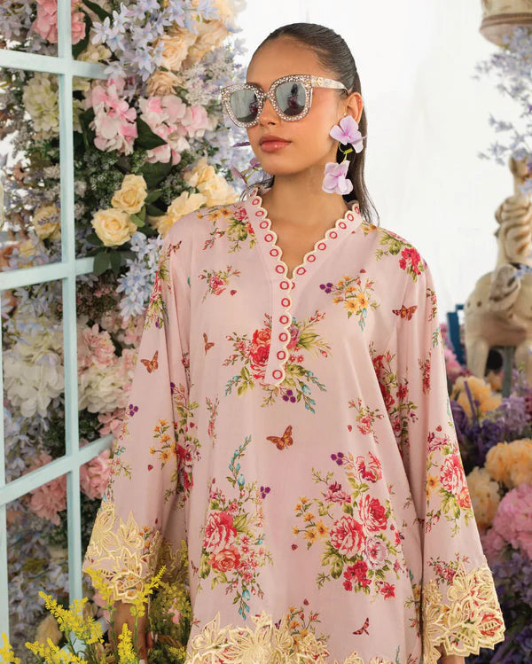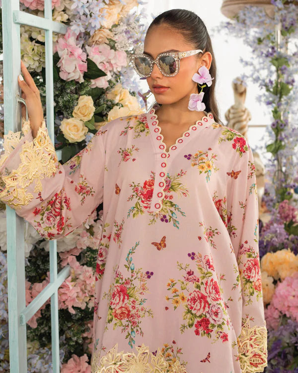 Introducing ‘Eloise A’ from our upcoming Lawn Pret Volume 2. This outfit features a light pink kumeez with beautiful floral print and cutwork with embroidery. Paired elegantly with a flapper shalwar cut from the same material finished with organza and lace along the edges.